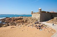 Oude Portugese fortificaties aan de kust. Langs de randen van de Atlantische Oceaan en op de strategische punten rondom de havens van Porto grote forten gebouwd. Veel locale bewoners verzamelen op deze plekken voor vertier op het strand.