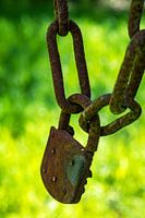 Koop de foto Oud, roestig slot aan roestige ketting van Flatfield op canvas, aluminium dibond, (ingelijste) fotoprint, behang en ArtFrame, op maat geprint in Fine-Art kwaliteit.