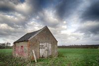 Dynamische foto van een oud, vervallen schuurtje in een groen weiland bij Cothen, Nederland. De wolkenlucht maakt de foto zo indrukwekkend, door de afwisseling van de blauwe hemel, de witte wolken en de donkere wolken, en dat alles tegelijk!