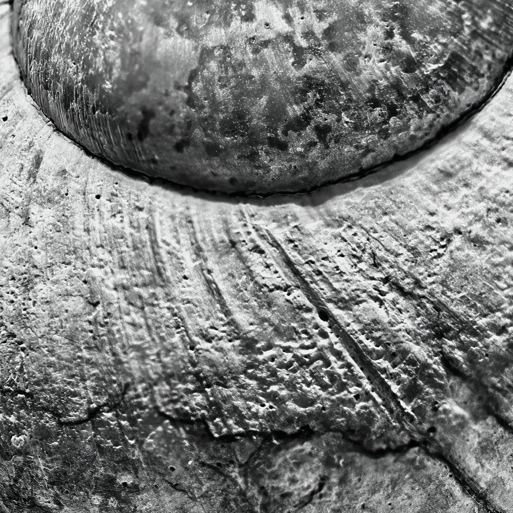 Zwaar verweerd schild van een Romeinse slak. Samengestelde macro met hoog contrast, sterke highlights en schaduwen, met grafisch effect, zwart-wit.