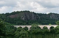 Het oude treinviaduct over de rivier Orne in Clécy in Zwitser Normandië. Hier gezien van een afstand, verscholen in de bossen.