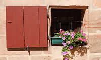 Oud venster met luik en bloembak Oude stad, Neurenberg, Franken, Beieren, Duitsland, Europa