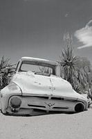 Een oude verroeste verlaten oldtimer auto wrak in het zand van de woestijn in Namibie bij het plaatsje Solitaire met een blauwe lucht. Zwart wit