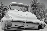 Een oude verroeste verlaten oldtimer auto wrak in het zand van de woestijn in Namibie bij het plaatsje Solitaire met een blauwe lucht. Zen, rust. Zwart wit, vintage