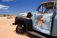 Een verlaten oud verroest oldtimer autowrak in de woestijn van Namibie bij het plaatsje Solitaire. Karakteristiek vintage verlaten