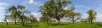 Panorama van oude fruitbomen in een boomgaard met grazende koeien. Appelbomen in de bloesem in een oude boomgaard tijdens een mooie dag in het voorjaar. De fruitbomen groeien in een veld waar in de verte koeien grazen. Panorama foto.