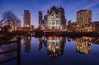 De Oude Haven in Rotterdam Blaak bij zonsondergang, met prominent in beeld het Witte Huis, lange tijd het hoogste kantoorgebouw van Europa. De Oude Haven wordt omgeven door enkele bijzondere bouwwerken, te weten de rode Willemsbrug en de iconische Kubuswoningen. Het Witte Huis bleef gespaard bij het bombardement van Rotterdam en heeft daarom als een van de weinige gebouwen in de wijk nog een klassieke uitstraling.
