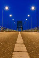 Avondfoto van de Oude IJsselbrug over de IJssel tussen Zwolle en Hattem na zonsondergang. Uitzicht vanaf het midden van de weg op de oude stalen boogbrug.