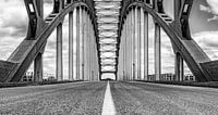 Oude IJsselbrug over de IJssel tussen Zwolle en Hattem. Uitzicht vanaf het midden van de weg op de oude stalen boogbrug. Zwart-wit foto.