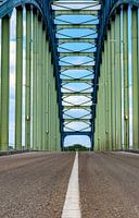 Oude IJsselbrug of Katerveerbrug over de IJssel tussen Zwolle en Hattem. Uitzicht vanaf het midden van de weg op de oude stalen boogbrug.