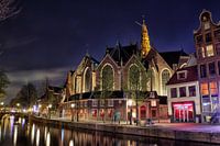 Nachtfoto van de Oude Kerk, het oudste bewaard gebleven gebouw van Amsterdam, Nederland.