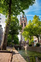 Oude Kerk in Delft gezien vanaf De Oude Delft tijdens een zomerse dag in de stad in Zuid-Holland, Nederland.De Oude kerk is ook koud Oude Jan of Scheve Jan vanwege de scheve toren.