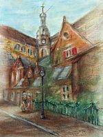 De Oude Kerk in Haarlem is een monument en staat in het centrum van Haarlem. En de kerk is zeker de moeite waard om hem ook van binnen te bekijken. Veel toeristen bezoeken de kerk. De kerk is hier getekend met pastelkrijt op canvas en is als een ouderwets plaatje.