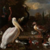 Mozaïek fotobewerking van een schilderij van Melchior d’ Hondecoeter, vogels, eenden en pelikaan.