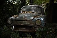Oude, verlaten Simca op een regenachtige herfstdag.
