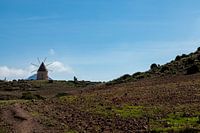 Koop de foto Oude Spaanse windmolen in desolaat landschap San Jose, Almeria. van Marjolein Zijlstra op canvas, aluminium dibond, (ingelijste) fotoprint, behang en ArtFrame, op maat geprint in Fine-Art kwaliteit.
