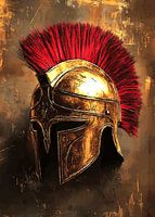 Deze indrukwekkende afbeelding toont een antieke soldatenhelm van goudkleurig metaal met uitgebreide decoraties. De helm heeft een opvallende rode kuif, die hem een imposante en strijdlustige uitstraling geeft. Het licht weerkaatst op het metalen oppervlak en benadrukt de fijne details en tekenen van slijtage. De achtergrond in warme, aardse tinten versterkt het historische en epische karakter van het motief, dat doet denken aan Romeinse of Griekse krijgers.