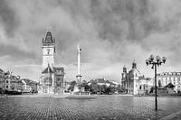 Ochtendstemming op het Oude Stadsplein, Staroměstské nám, in Praag. Het Oude Stadhuis, de St. Mariazuil en de St. Nicolaaskerk zijn zichtbaar.