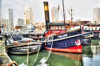 De oude stoomboten, die nu museum stukken zijn liggen rustig aangemeerd in de oude Leuvehaven van Rotterdam. Op de achtergrond het moderne Rotterdam.