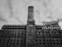 Zwart wit opname van een oude, leegstaande suikerfabriek in Brooklyn, New York.