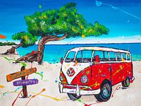 Kleurrijk schilderij van een VW transporter op het strand van Aruba van de kunstenaar Renate Rolefes.