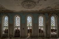Oude vensters met glas in lood in de hal van een verlaten sanatorium.