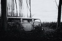 Zwart wit foto van een oude Volkswagen Transporter in een bos.