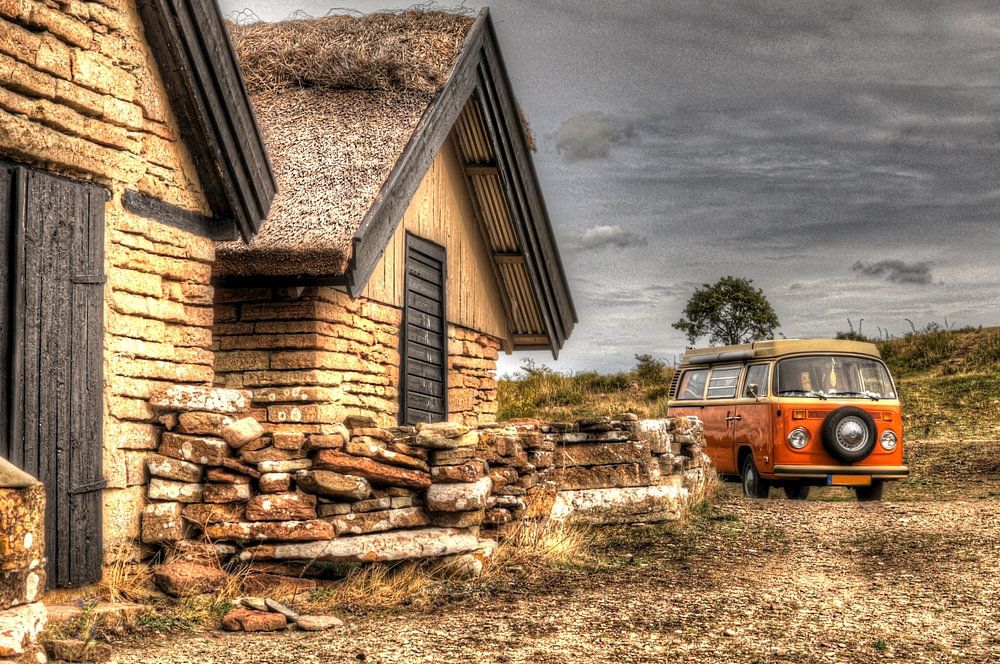 Öland is een Zweeds eiland in de Oostzee. Het is het op een na grootste eiland van Zweden, na Gotland. Het eiland staat vooral bekend onder kunstenaars en kunstenaressen vanwege de prachtige kleuren die daar ontstaan tijdens de zonsopkomst en zonsondergang. Op de foto zijn de gerestaureerde hutten van vissers te zien en een oude Volkswagen bus op de achtergrond. De foto is in HDR genomen en bewerkt