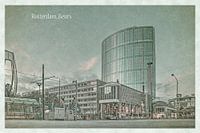 De kleuren, krassen en vlekken op deze afbeelding suggereren dat we hier te maken hebben met een oude ansichtkaart uit het begintijdperk van de kleurenfotografie. En het Beursgebouw, daterend uit 1940, is ook alweer een of tachtig oud. toch is dit geen echte vintage ansichtkaart maar een kunstmatig verouderde recente foto.