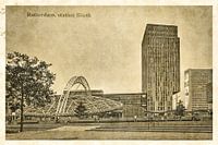 Station Rotterdam Blaak, waarvan we hier het bovengrondse deel zien, werd opgeleverd in de jaren negentig, samen met de spoortunnel. De kantoorgebouwen erachter staan er pas een paar jaar. Dit is dus geen echte honderd jaar oude ansichtkaart maar een kunstmatig verouderde digitale foto.