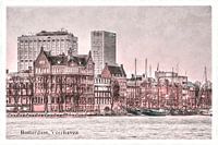 De Rotterdamse Veerhaven met zeilschepen en omliggende bebouwing is in honderd jaar niet zoveel veranderd. Alleen de twee torens van het Erasmus MC op de achtergrond doen vermoeden dat dit geen echte oude ansichtkaart is maar een kunstmatig verouderde digitale foto.