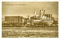 Het voormalig cruiseschip SS Rotterdam werd in 1959 gebouwd, maar ligt pas sinds 2008 op deze vaste plek in Katendrecht, tegenover de graansilo van Meneba. Dat doet vermoeden dat dit geen echte vintage ansichtkaart is maar een recente foto, kunstmatig verouderd in een badje van Photoshop.