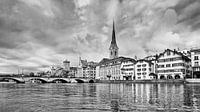 Uitzicht op oude architectuur met een rivier en dramatische wolken in het historische stadscentrum van Zürich, Zwitserland