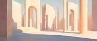 Een futuristisch landschap van sculpturale zuilen en filigraanbogen schittert in zachte pastelkleuren en geeft een gevoel van ruimte en rust. De harmonieuze verlichting creëert een bijna dromerige sfeer. Dit kunstwerk, dat perfect is voor een woonkamer, nodigt uit om te vertoeven en te dromen terwijl het moderne elegantie uitstraalt.