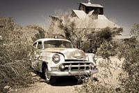 Oude antieke Chevrolet, achtergelaten in de hete woestijn van Amerika. De prachtige oldtimer staat te verroesten in de volle zon, roest op de carrosserie, de ramen kapot, en de motor voor altijd stil. Een prachtige auto ondanks de staat van verval.