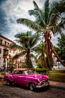 klassieke oldtimer in roze in straat met palmbomen in Havana Cuba