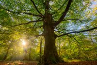 Enorme oude beukenboom in een bijenbos met groen en goudbruin blad in het natuurgebied Rijsterbos in de streek Gaasterland in Friesland.