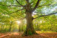 Enorme oude beukenboom in een bijenbos met groen en goudbruin blad in het natuurgebied Rijsterbos in de streek Gaasterland in Friesland.
