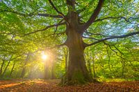 Massieve oude beukenboom in een beukenbos met groene en goudbruine bladeren in het natuurgebied Rijsterbos in de regio Gaasterland in Friesland, Nederland.