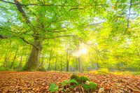 Massieve oude beukenboom in een beukenbos met groene en goudbruine bladeren in het natuurgebied Rijsterbos in de regio Gaasterland in Friesland, Nederland.