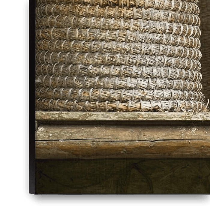 Koop de foto Oude bijenkorven van stro in landelijke sfeer van Birgitte Bergman als print op canvas, aluminium dibond, (ingelijste) fotoprint, behang en ArtFrame. Voor jou op maat geprint in Fine-Art kwaliteit.
