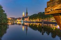 Oude stad met Sint-Petruskerk, Mariakerk en rivier de Trave bij schemering, Lübeck, Sleeswijk-Holstein, Duitsland | Oude stad met Sint-Petruskerk, Mariakerk en rivier de Trave bij schemering, Lübeck, Sleeswijk-Holstein, Duitsland