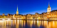 Wühre bank met de Fraumünster en de kerk St. Peter in de oude binnenstad van Zürich bij nacht.