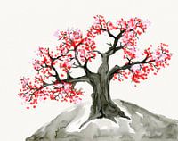Een tekening met waterverf van een oude boom die op een kleine heuvel staat. De boom ziet er knoestig uit. De boom heeft digitaal getekende rode en roze bloemetjes. Mooi grafisch effect door minimaal kleurgebruik.