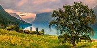 Oude boerderijen aan het Lovatnet-meer in de Lodalen-vallei bij zonsopgang, dicht bij het dorp Loen in de provincie Sogn og Fjordane, Noorwegen