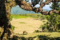 Dikke oude boom en een grasvlakte in Fanal, Madeira, Portugal. Op de achtergrond grazen koeien en linksboven is de Atlantische Oceaan te zien.