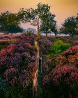 Een oude boom half staand in een kleurvol heideveld nabij Hilversum een mooie ochtend met zonsopkomst.