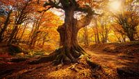 Oude boom met zonnestralen in het herfstbos