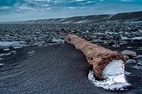 Een aangespoelde boomstronk op het zwarte strand van Jokulsarlon.