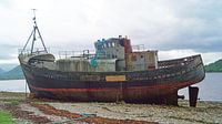 Een oude vistrawler ligt op het strand bij Corpach, Fort William in de Schotse Hooglanden